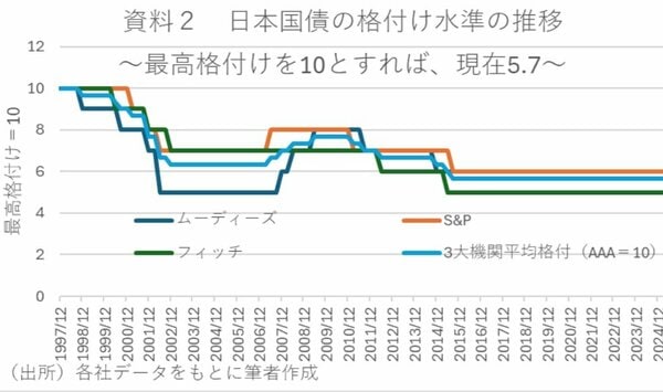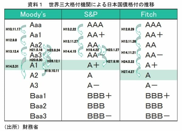 日本国債の格付けは、世界三大格付け機関によって1998年以降、計16回の格下げと計4回の格上げがされている(資料1)。