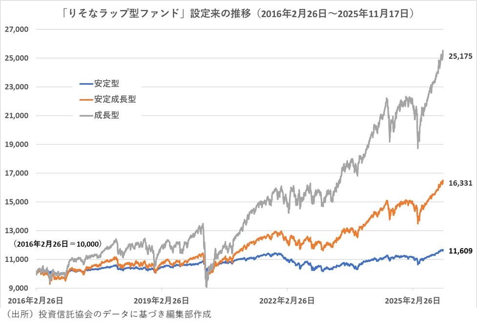 投資家にとってあらかじめ「目標リターン」があるファンドは、資産形成を考えるうえで便利だ。ただ、運用に絶対はないため、「りそなラップ型ファンド」も目標どおりのリターンを残せているわけではない。リスク水準は良く管理されているが、リターンは目標を上振れている。実際の運用成績は、2025年10月末時点で「安定成長型」のリターンが3年で34.30%、5年で51.78%で、「短期金利(0~0.5%程度)+4%」という水準を大きく上回っている。「成長型」は3年で59.73%、5年で120.36%だ。こちらも「短期金利+6%」よりはるかに高い。しかも、リスクの水準は「安定成長型」は3年で6.92、5年で7.26なので目標より低い。「成長型」のリスクも3年で10.33、5年で11.03だ。リスクの水準は比較的コントロールされている。