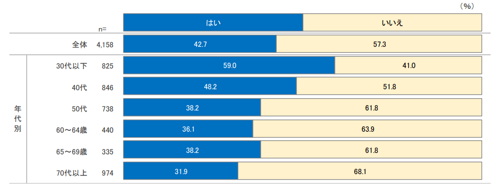この質問でも年代による回答差が見られ、30代以下では59.0%が援助に前向きな一方、70代以上では31.9%にとどまっている。若い世代ほど資金援助に積極的な理由としては、自身の子どもがまだ小さく、これからかかるであろう教育費などを作っていこうという意向があるのかもしれない。対して高齢世代では、すでに相続や生前贈与など別の形で資産移転を考えている可能性も考えられる。