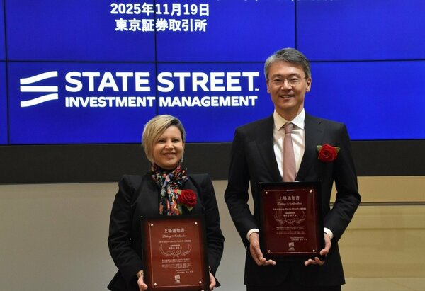 ステート・ストリート・インベストメント・マネジメントは11月19日、東京証券取引所に米S&P500指数や金価格などを連動対象とするETF5銘柄を上場した。同日、東証でその上場セレモニーが開催され、同社最高事業責任者(CBO)のアンナ・パグリア氏や、日本法人の代表取締役社長 越前谷道平氏をはじめ関係者が参加。上場通知書を受け取り、記念の打鐘を行った。
