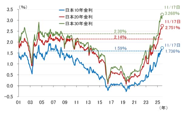 図表1には、20年金利と30年金利も掲載していますが、財政リスクやインフレリスクの強まりがタームプレミアムを拡大させており、そのプレミアムは10年金利より超長期金利の方が高くなります。実際、上昇幅は超長期金利の方が大きくなっています。