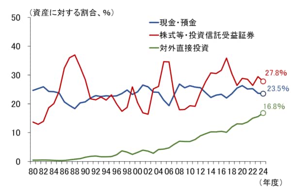 目立って割合が高まっているのは「対外直接投資」です。2024年度末の16.8%は、20年前の2004年度4.2%の4倍、額にして221.9兆円の増加と、同期間の「現金・預金」の増加額172.9兆円増をはるかに上回っています。