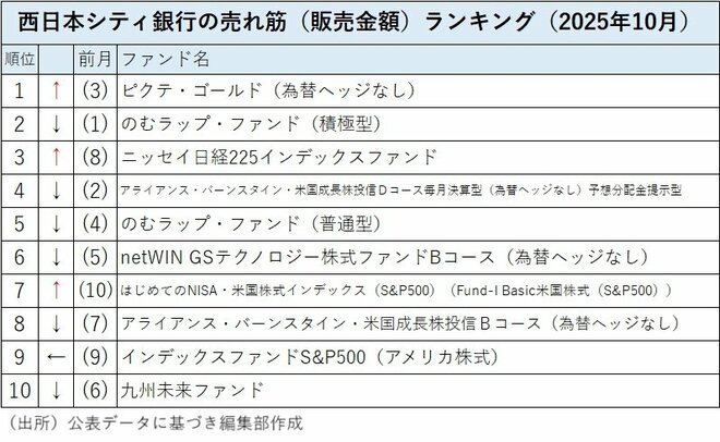 西日本シティ銀行の投信売れ筋ランキングの2025年10月のトップは前月第3位だった「ピクテ・ゴールド(為替ヘッジなし)」になった。前月トップだった「のむラップ・ファンド(積極型)」は第2位に後退。第3位には前月第8位だった「ニッセイ日経225インデックスファンド」がジャンプアップした。前月第2位の「アライアンス・バーンスタイン・米国成長株投信Dコース毎月決算型(為替ヘッジなし)予想分配金提示型」は第4位になった。また、前月第10位だった「はじめてのNISA・米国株式インデックス(S&P500)」が第7位に上がるなど、純金価格に連動するファンドや日米の主要インデックスに連動するインデックスファンドなど単純にリスク資産に投資するファンドが人気化している。
