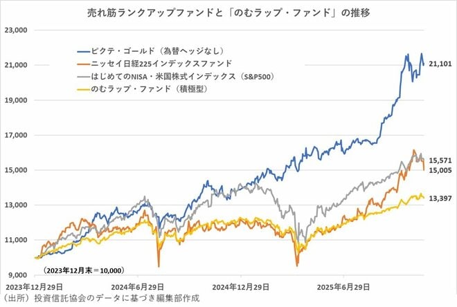 このような価格変動に対して「のむラップ・ファンド(積極型)」は、静かに基準価額の水準を切り上げるという動きになった。もっとも、リターンの水準は、2023年12月末を起点にしても、2024年12月末を起点にしても、依然として「ピクテ・ゴールド(為替ヘッジなし)」や「ニッセイ日経225インデックスファンド」の方が高い。「ピクテ・ゴールド(為替ヘッジなし)」と「のむラップ・ファンド(積極型)」のリターンは圧倒的な差があるため、単純にリスク管理に優れたファンドの方が良いと言い切れないところもある。