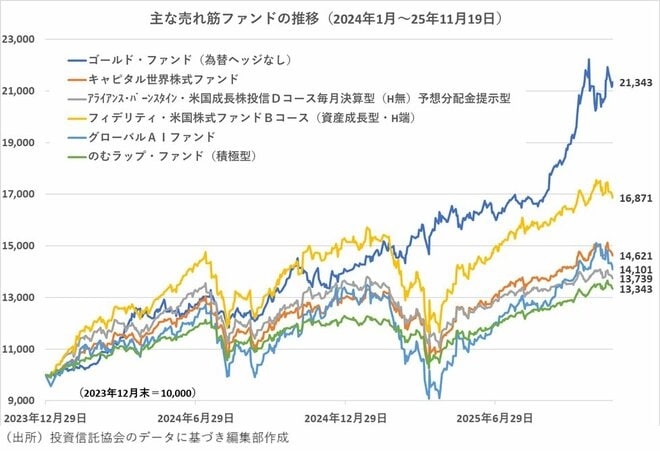 そして、10月に売れ筋ランキングで順位を上げた「キャピタル世界株式ファンド」の46.21%増が「フィデリティ・米国株式ファンド Bコース(資産成長型・為替ヘッジなし)」に次ぐ成績だ。「アライアンス・バーンスタイン・米国成長株投信Dコース毎月決算型(為替ヘッジなし)予想分配金提示型」、「グローバルAIファンド」も同じような水準になっている。11月19日時点で「のむラップ・ファンド(積極型)」が33.43%増であり、「アライアンス・バーンスタイン・米国成長株投信 Dコース毎月決算型(為替ヘッジなし)予想分配金提示型」の37.39%増は大きな違いがなくなってきている。毎月決算型で分配金を払い出す魅力が評価に上乗せされていると考えられるが、トータルリターンで「のむラップ・ファンド(積極型)」をより大きく上回る成績が期待されている。