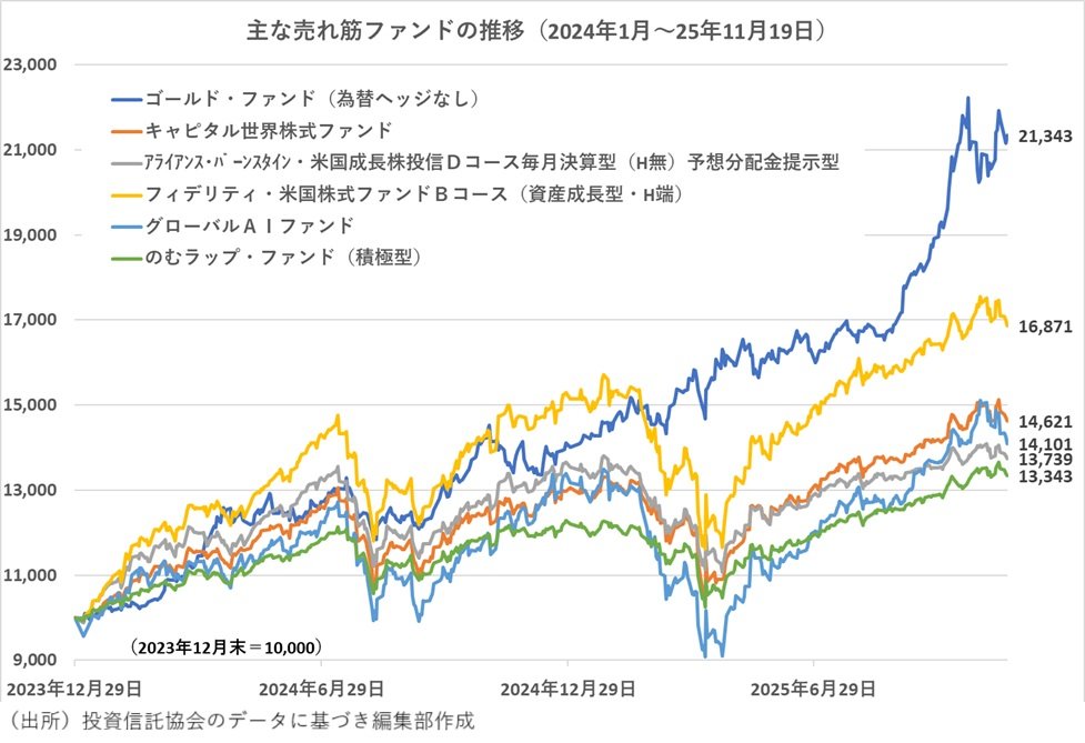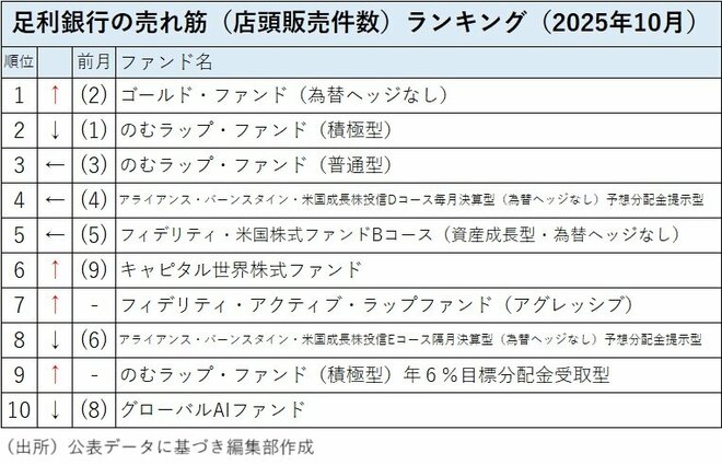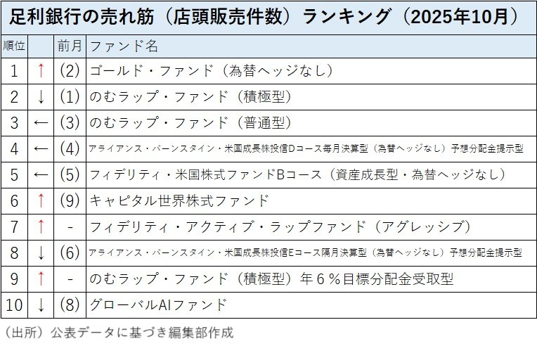 足利銀行の投信売れ筋ランキング(販売件数)の2025年10月のトップは前月第2位だった「ゴールド・ファンド(為替ヘッジなし)」が上がった。前月トップだった「のむラップ・ファンド(積極型)」は第2位に後退した。前月第3位から第5位は変わらず、「のむラップ・ファンド(普通型)」、「アライアンス・バーンスタイン・米国成長株投信 Dコース毎月決算型(為替ヘッジなし)予想分配金提示型」、「フィデリティ・米国株式ファンド Bコース(資産成長型・為替ヘッジなし)」が続いた。そして、第6位には前月第9位だった「キャピタル世界株式ファンド」がジャンプアップし、第7位にはトップ10圏外から「フィデリティ・アクティブ・ラップファンド(アグレッシブ)」がランクインした。