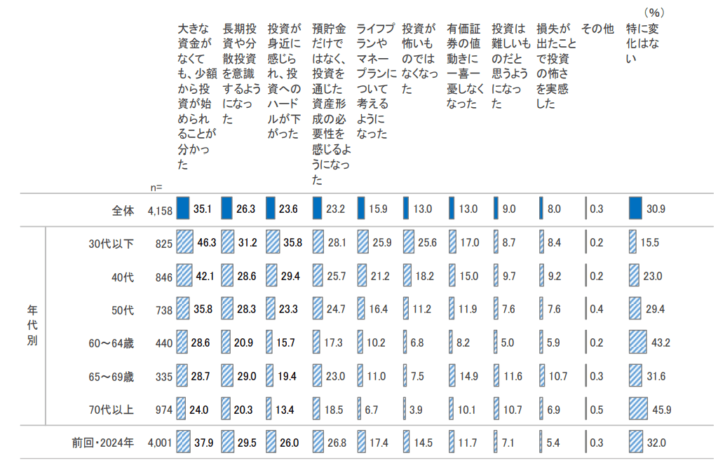 次いで「長期投資や分散投資を意識するようになった」(26.3%)、「投資が身近に感じられ、投資へのハードルが下がった」(23.6%)、「預貯金だけではなく、投資を通じた資産形成の必要性を感じるようになった」(23.2%)と続いている。