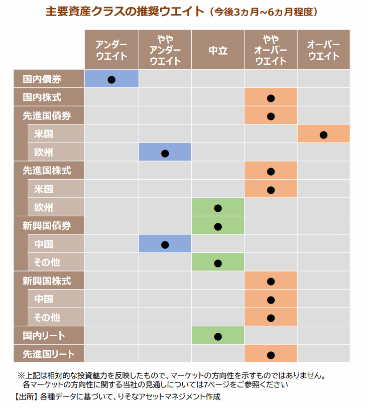資産配分:向こう3-6ヵ月は、引き続き緩やかな世界景気の拡大を見込み、株式をややオーバーウエイトとする資産配分戦略が適切と考えます。