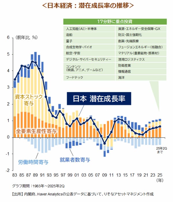 高市政権は、成長戦略の司令塔となる『日本成長戦略本部』を新設し、AI(人工知能)など17分野への重点投資を通じた潜在成長率アップを目指します(下図表)。民間企業による設備投資を促すため、「設備投資促進税制」を創設し、設備投資の取得費用を初年度に一括して計上できる「即時償却」の導入などが検討される見通しです。