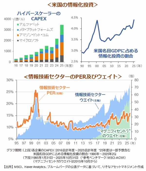 IMF(国際通貨基金)は10月発表の世界経済見通しでAI(人工知能)投資の急増が2000年前後のITバブルと類似していると指摘した上で、世界経済の下振れリスクの一つになると警鐘を鳴らします。クラウドサービスを大規模に展開する代表的ハイパースケーラー4社※の資本的支出(CAPEX)はここ数年で急加速、投資回収を不安視する見方も出ています。