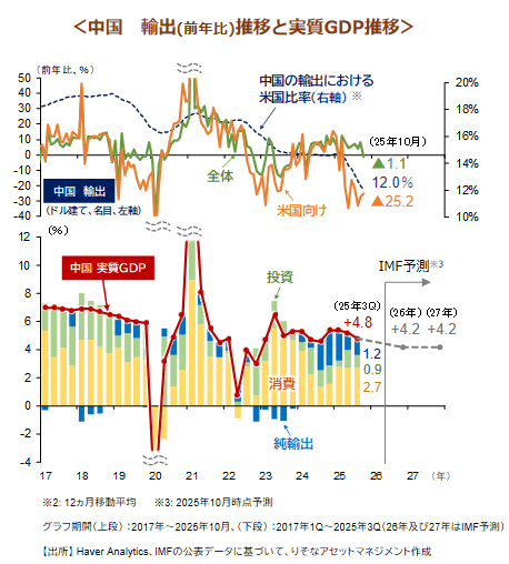 中国経済については内需の低迷が続くものの、投資・外需主導の成長が期待され、株式市場でAI・半導体など製造業セクターが評価される余地はなお大きいと考えられます。