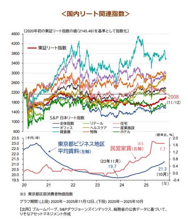 東証リート指数(配当なし)は11月11日、約3年ぶりに2000ポイントの大台を回復しました。過去2年、日銀の金融政策正常化に伴う国内金利の先高感から、日本株に劣後する動きが続いていました。しかし、2025年に入りJリート市場に見直し買いが増え、配当込みでの年初来※1の東証リート指数の上昇率は26.5%と東証株価指数(TOPIX)の23.4%を上回ります。