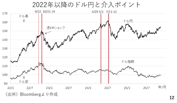 尚、2022年10月や2024年7月の介入後、ドル円が下落に転じており、介入が効果を発揮したと映ります。ただ、ドル指数に着目するといずれの場面においても、米国におけるインフレ圧力の減退などによってドルが下落に転じた場面と重なります。つまり、二つの局面で介入が効いたように映るのは、ドルが下落に転じる場面と重なったに過ぎないと言えます(スライド12)。