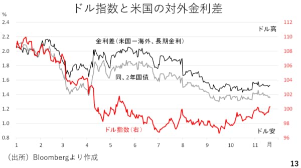 今週はドル高も進みました。米国の対外金利差に照らし、ドル指数は相互関税が表明された4月以降、大幅安となりました。ただ、9月の利下げ再開後、ドル安材料の出尽くしとともに徐々に持ち直しつつあることがわかります。仮に、ドル指数が2年債でみた金利差と整合的な水準を回復するなら101~102まで、長期金利なら103近辺まで反発しても不思議ではありません(スライド13)。