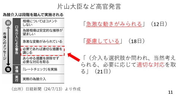 さて、今週の円安に対して片山大臣の円安牽制発言のギアが一段上がりました。介入が選択肢か?と問われた際に、「必要に応じて適切な対応をとる」と発言したのです。日本経済新聞のまとめによれば、これまでの「急激な変動が見られる」との発言からさらに一歩介入に近づきました。徐々に介入警戒感が高まる可能性も充分です(スライド11)。