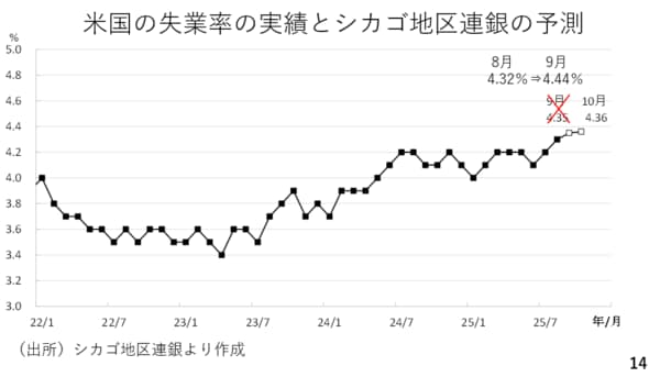 今週のドル高の背景に12月の利下げ観測の後退がありました。今週、発表された10月開催分のFOMC議事要旨によれば、多くの(Many)参加者がインフレに照らし、12月の利下げに慎重なスタンスであったことが明らかになりました。ただ、20日に発表された9月の失業率は8月から上昇(悪化)していました。小数点以下第2位まで算出すると8月の4.32%から9月は4.44%と実際には0.1%ポイント以上の悪化です(スライド14)。