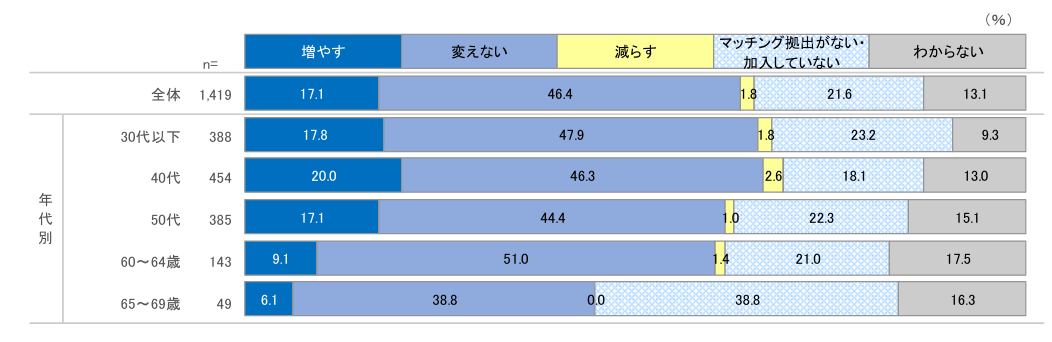 iDeCoについても「変えない」が46.4%と最も多く、「増やす」が17.1%、「減らす」が1.8%となった。マッチング拠出と比較すると、「増やす」という回答がやや多い傾向が見られる。年代別では、「増やす」が最も高いのは40代(20.0%)、次いで30代以下(17.8%)、50代(17.1%)となっており、以降は年代が上がるにつれて増やす意向は減少する。