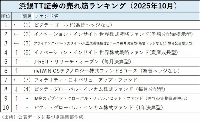 浜銀TT証券の投信売れ筋ランキングの2025年10月のトップは6月以来5カ月連続で「ピクテ・ゴールド(為替ヘッジなし)」(設定はピクテ・ジャパン)だった。トップ3は前月と変わらず第2位に「イノベーション・インサイト 世界株式戦略ファンド(予想分配金提示型)」(三井住友トラスト・アセットマネジメント)、第3位は「アライアンス・バーンスタイン・米国成長株投信 Dコース毎月決算型(為替ヘッジなし)予想分配金提示型」(アライアンス・バーンスタイン)だった。第5位にトップ10圏外から「J-REIT・リサーチ・オープン(毎月決算型)」(三井住友トラスト・アセットマネジメント)、第9位に「お金のデザイン・グローバル・リアルアセット・ファンド(世界の実物資産中心)」(お金のデザイン)がランクインするなど、不動産に着目したファンドが注目を集めている。