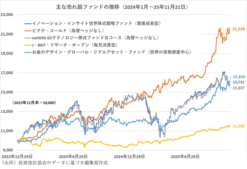 一方、10月にトップ10にランクインした「お金のデザイン・グローバル・リアルアセット・ファンド(世界の実物資産中心)」はETF(上場投資信託)に投資することによって実質的に、純金(ゴールド)や銀、白金(プラチナ)、不動産などに投資するファンドだ。2023年12月末を基準として2025年11月21日までのパフォーマンスを調べると同ファンド(+58.06%)は「netWIN GSテクノロジー株式ファンド」(+56.57%)や「イノベーション・インサイト 世界株式戦略ファンド」(+57.31%)をわずかながら上回る成績になっている。