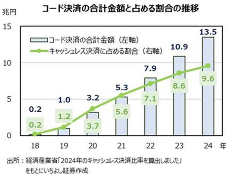 神様:はい。コード決済はここ数年で大きく成長しています。キャッシュレス推進協議会によると、2023年のキャッシュレス決済の件数は全体で342.5億件でしたが、そのうちコード決済は93.6億件でした。全体の約27%を占め、クレジットカードに次ぐ決済手段です。決済額で見ると、2024年のコード決済額は13.5兆円であり、キャッシュレス決済に占める割合は9.6%でした。2018年時点では0.2%でしたから、その存在感は大きく増しています。