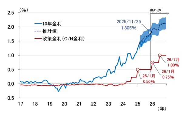 図表5の見通しは、1990年1月から2024年12月までの10年金利を、無担保コールレート・オーバーナイト物、景気動向指数(先行CI)、消費者物価指数(生鮮食品及びエネルギーを除く)、日銀の国債買入額などを説明変数として推計し、得られた結果を延長して作成したものですが、当時の予測では、日本銀行が12月か2026年1月に利上げすれば、10年金利は2%近くまで上昇し、2026年中にもう1度利上げすれば2%台前半で推移するとみていました。