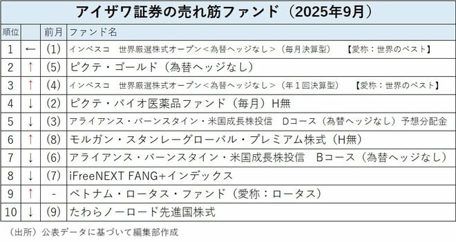 アイザワ証券の投信売れ筋ランキングの2025年10月のトップに立ったのは前月と同じ「インベスコ 世界厳選株式オープン<為替ヘッジなし>(毎月決算型)」(設定はインベスコ・アセット・マネジメント)だった。第2位には前月第5位から「ピクテ・ゴールド(為替ヘッジなし)」(ピクテ・ジャパン)が、第6位には前月第8位から「モルガン・スタンレーグローバル・プレミアム株式(為替ヘッジなし)」(三菱UFJアセットマネジメント)が上がった。また、トップ10圏外から「ベトナム・ロータス・ファンド」(ファイブスター投信投資顧問)が第9位にランクインした。