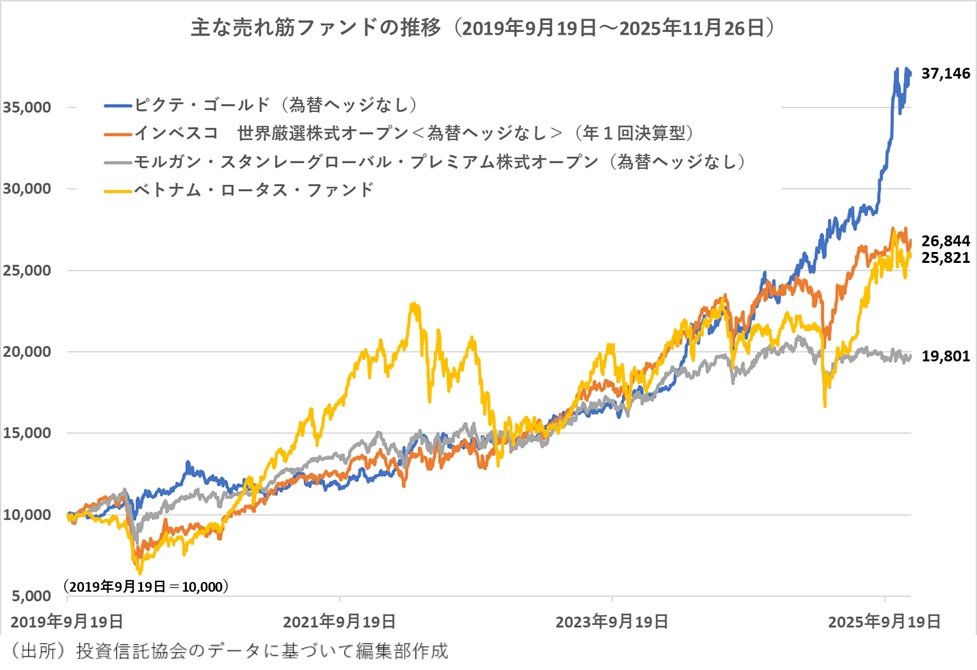 これら、新たに人気化しているファンドのパフォーマンスを調べると、2025年10月末時点で過去1年間のトータルリターンが43.10%の「ピクテ・ゴールド(為替ヘッジなし)」をはじめ、パフォーマンスに優れたファンドになっている。「ベトナム・ロータス・ファンド」は22.33%ながら、過去6カ月では42.98%と短期間で際立って大きな上昇率になっている。