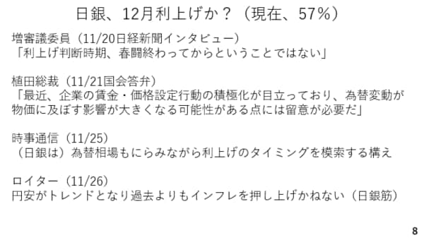 一方、日本では12月の利上げの織り込みが上昇しました。先週の増審議委員の発言や植田総裁の国会答弁に続き、時事通信やロイターなど各メディアも12月の利上げの可能性を報じています。確かに12月に利上げを見送った場合、年末から年始にかけてドル円が160円付近まで上昇する可能性が高く、12月の利上げの可能性は高くなったと考えられます。また、同時に円買い介入が実施される可能性にも注意が必要でしょう(スライド8)