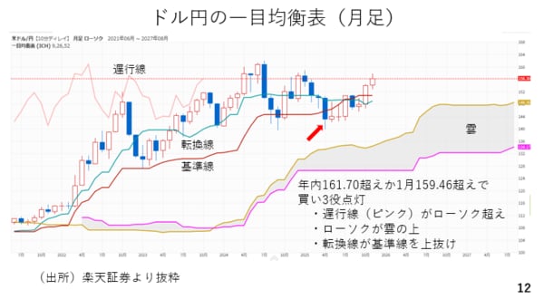 1月にシグナル点灯のハードルが下がるのは、赤い矢印で示す9ヶ月前の140円を割り込んだ月のデータが計算から取り除かれる為です。一目均衡表からみると、ドル円の一段高を阻止する為には、この160円付近を防衛する必要がありそうです(スライド12)。