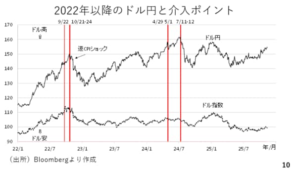 こうした経緯に照らせば、次の為替介入は少なくとも160円を超えた後と考えられます。ただ、為替のチャート分析上、160円付近は非常に重要な意味を持っており、当局も160円の防衛を意識して介入することが必要かもしれません(スライド10)。