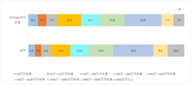実は年収300万円未満といっても年齢層は多様だ。たとえば高齢世代で公的年金だけが収入源の人でも、現役時代は高年収で、その時の貯蓄の積み上げが結果に表れている可能性もある。なお保有額の平均は約1400万円で、全体(約1720万円)に比べると320万円ほど低い水準だった。
