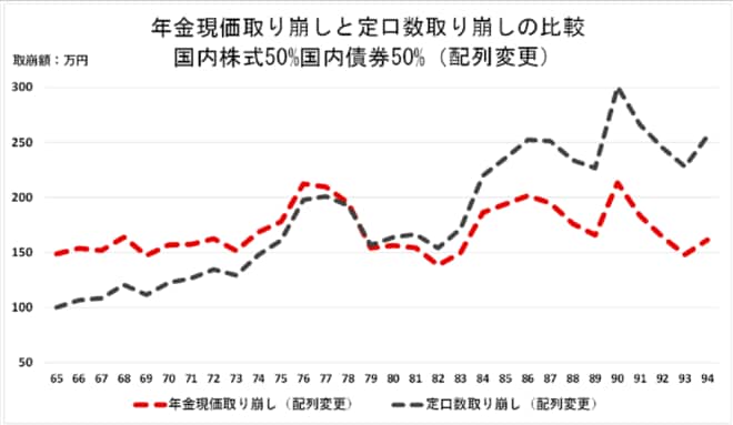 年金現価率と定口数取り崩しの違いを配列変更の収益パターンを用いて比較すると、年金現価率では取り崩し額は赤色の点線のとおり当初額より緩やかに増え、おおよそ150万~200万円の幅で安定推移する(図表13)。定口数取り崩しにおける当初額の低さの課題を解消する結果となっている。実は定口数取り崩しの方法は年金現価率取り崩しを予定利率0%で行う場合と同一となる。予定利率0%、つまり運用しないので現価率は30年で30、29年で29、・・・となるからである。予定利率+インフレ率程度の収益率が得られれば、実質価値で安定的な取り崩しが可能となる。