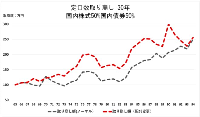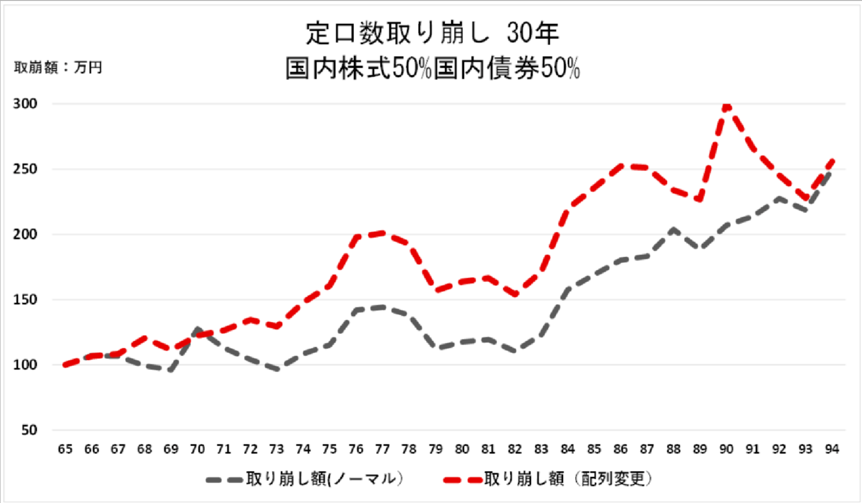 図表11はリスク抑制のポートフォリオでノーマル配列と配列変更で実施し表示は取り崩し額のみにしている。残高は途中の額は異なるが両者とも30年でちょうど0円になる。ノーマル配列の総取り崩し額は4,379万円、取り崩し額の最高値は最終年の250万円、最低値は96万円になった。配列変更の場合は、総取り崩し額は5,485万円となり、取り崩し額の最高値は300万円、最低値は最初の100万円という結果である。基準価格の上昇に伴って取り崩し額が大きく増加していく。