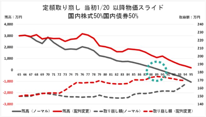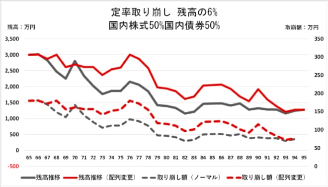 結果はノーマル配列のグレーの線は89歳で枯渇、先ほどの83歳より6年延びた。総取り崩し額も3,706万円で3,000万円を超え、リスク抑制の効果がうまく出た。配列変更の赤線は、95歳まで持ち、192万円残った。総取り崩し金額は4,924万円と先ほどと同じである。なお、このリスク抑制型ポートフォリオは便宜的に投資対象を国内の株と債券半々の組合せとしたが、実践では債券の代わりに一部キャッシュを組み合わせたり、外国株などを組み入れたりなど、ポートフォリオ組成にあたって改善・工夫の余地がある。