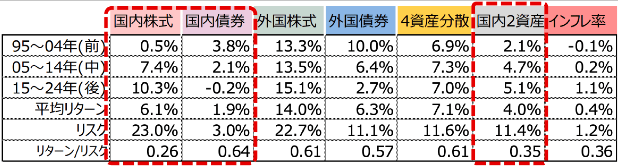 〔図表6〕伝統4資産の30年間の平均収益率およびリスク(1995/1初~2024/12末)