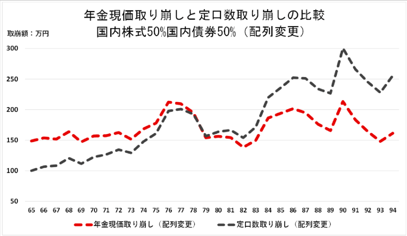定口数取り崩しの特性は、予定年数で使い切りができる点が当初の目的と合致している。取り崩し額は基準価格の上昇に伴って増額するため、インフレ対応には好ましいが、インフレ率を超える基準価格上昇分については後送りで取り崩すことになるという課題がある。つまり、取り崩し期の中でもより若い時代に多く使えないという課題である。そこで、あらかじめ基準価格の上昇を見込んで当初額を増やせないかというニーズが生じる。その点を解決するのが、毎年の残高を「取り崩し残余年数に応じた年金現価率」で除すという方法である。