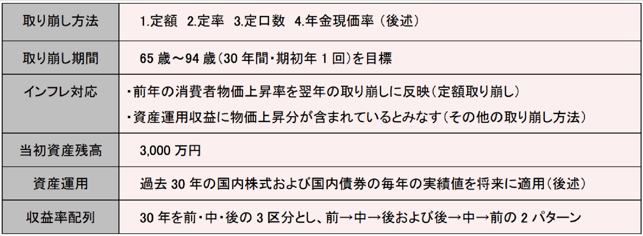 以上3点に留意しながら、枯渇リスクに対応した取り崩しの方法を、以下のシミュレーション前提を用いて検討する。