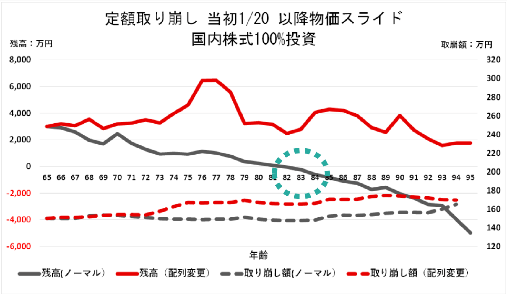 インフレについては、2022年~24年の3年は消費者物価総合指数で3%前後の上昇が続いており、日銀の物価安定の目標は2%としていることからも、インフレは恒常的に発生するとの前提を置くべきである。したがって取り崩し金額は、インフレに応じて増加させる方法を考えに入れる必要がある。