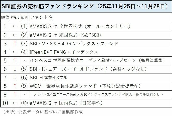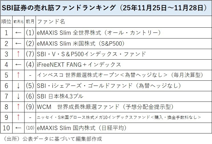 SBI証券の投信売れ筋(販売金額)ランキングの2025年11月最終週(11月25日~28日)のトップ2は前月と同様に「eMAXIS Slim 全世界株式(オール・カントリー)」(愛称:オルカン)、「eMAXIS Slim 米国株式(S&P500)」(ともに三菱UFJアセットマネジメント)だった。この2銘柄でトップと第2位を占めるのは2025年2月以来10カ月連続になる。第3位だった「eMAXIS NASDAQ100インデックス」(三菱UFJアセットマネジメント)はトップ10圏外に落ち、第3位には前月は第7位だった「SBI・V・S&P500インデックス・ファンド」(SBIアセットマネジメント)が上がった。また、トップ10圏外から「インベスコ 世界厳選株式オープン<為替ヘッジなし>(毎月決算型)」(インベスコ・アセット・マネジメント)が第5位に、新設ファンドの「ニッセイ・S米国グロース株式メガ10インデックスファンド<購入・換金手数料なし>」(ニッセイアセットマネジメント)が第9位にランクインした。