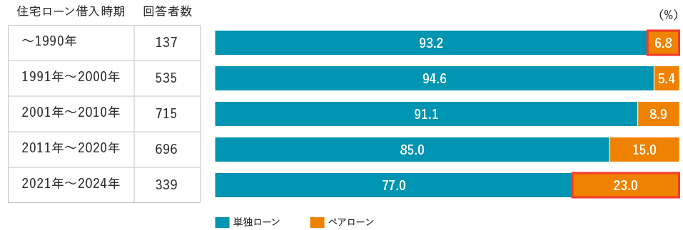 住宅ローンの借入形態には、1人で借りる「単独ローン」と夫婦やパートナーと2人で借りる「ペアローン」の2つの方法が代表的な借り方としてありますが、近年、不動産価格の高騰や共働き世帯の増加を背景に、ペアローンの利用が増加しています。ミライ研のアンケート調査でも、ペアローンの利用が高まっていることが分かっています(図表1)。