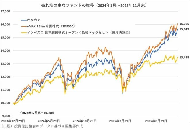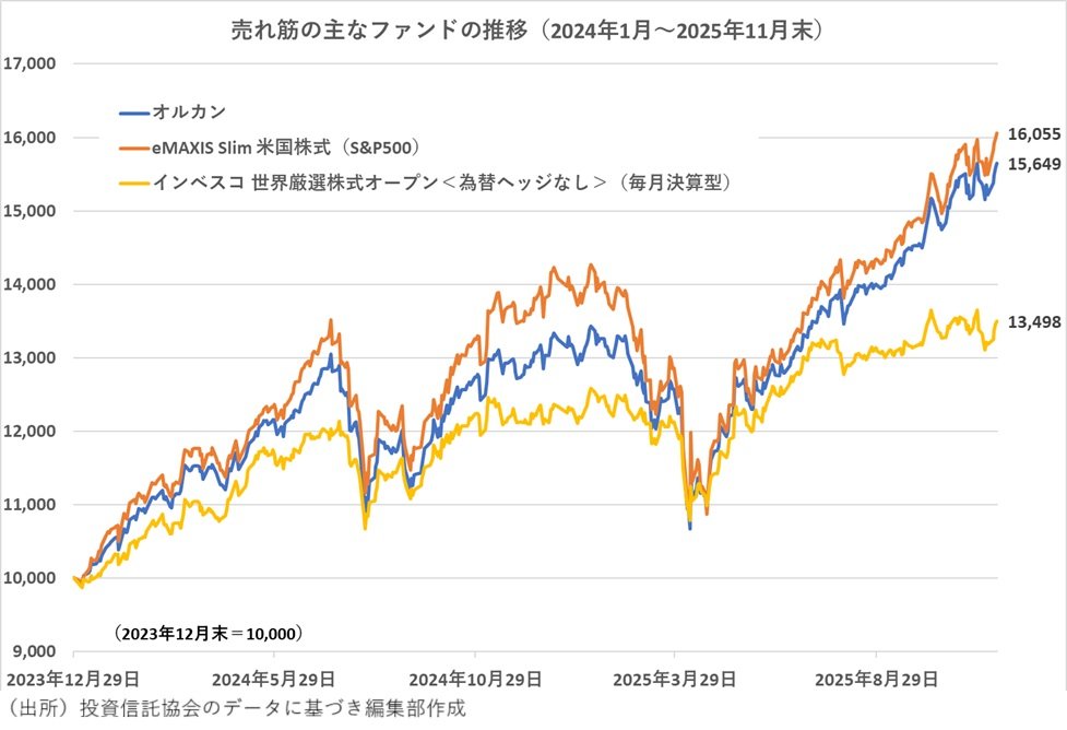 一方、米国株式市場への警戒感がより強い投資家が選択しているのが「インベスコ 世界厳選株式オープン<為替ヘッジなし>(毎月決算型)」だと考えられる。11月に売れ筋トップ10にランクインしてきたが、同ファンドのパフォーマンスが良くなった結果ではない。世界の市場から「ベスト」と判断できる株式に厳選投資するというコンセプトのファンドで、10月末時点の組み入れ上位10銘柄は、英国の「3iグループ」を筆頭に、米「マイクロソフト」、カナダ「カナディアン・パシフィック・カンザス・シティ」、英「ロースル・ロイス」、米「テキサス・インスツルメンツ」、香港「AIAグループ」など世界の市場に分散されている。米国の組み入れ比率は40.7%と「オルカン」よりもさらに低い水準にとどまっている。時価総額だけではなく、ファンドマネージャーの分析力や判断によって、組み入れ銘柄を変更できる点も、米国に異変が起きた時に迅速な対応が期待できると判断されたのではないだろうか。