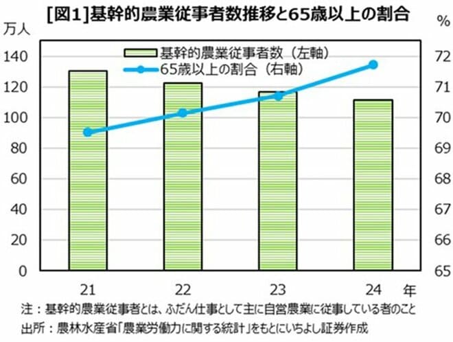 神様:お米だけでなく、日本の農業は現在危機的な状況にあると言えます。少子高齢化により農業従事者は減少傾向です。2024年の基幹的農業従事者は約111万人でしたが、2021年と比較すると約19万人減少しています。さらに、農業従事者の中で65歳以上は約80万人で、全体の約72%を占めます。労働環境の過酷さや後継者不足により、農業全体で高齢化が進行しているのです。