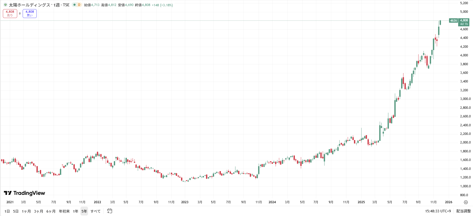 太陽ホールディングスは株価が急伸しています。2024年に2050円で取引を終えた株価は、トランプショックで急落した25年4月も堅調に推移し、足元では4800円を突破しています(2025年12月1日終値)。株価騰落率は年初来でプラス134.5%(2.3倍)と、日経平均株価(同プラス23.6%)を大幅に上回ります。
