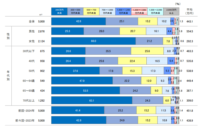 同調査では資産運用に関する多様な質問を行っているが、回答者5000人に個人年収についても聞いており、その平均は443.1万円となっている。年収帯で見ると「300万円未満」が42.6%と最も多く、次いで「300万〜500万円未満」(25.1%)が続く。つまり約7割が個人年収500万円未満であることが分かった。