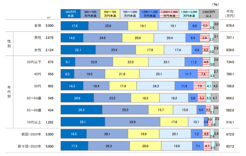 株式や投資信託などを持っている全国18歳以上5000人にその保有状況や証券投資への意識を聞いた「個人投資家の証券投資に関する意識調査報告書」(日本証券業協会、2025年9月公表)では回答者の世帯年収についても質問をしている。