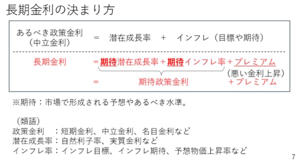 そこで、改めて長期金利について整理しておきましょう。長期金利は、期待潜在成長率と期待インフレ率とプレミアムの合計です。期待とは先々どうなりそうか、といった予想に基づくものです。また、プレミアムの拡大による長期金利の上昇がいわゆる「悪い金利上昇」です。