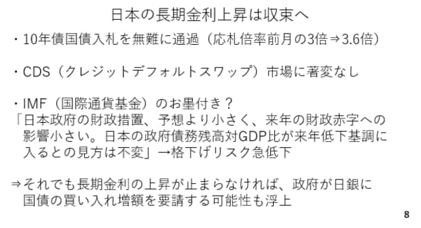 さらに、4日には国際通貨基金が日本の政府債務残高の対GDP比が低下するとの見方を変える必要はないとコメントしました。経済対策による財政悪化への影響が限定的であるとする国際的なお墨付きを得た形です。