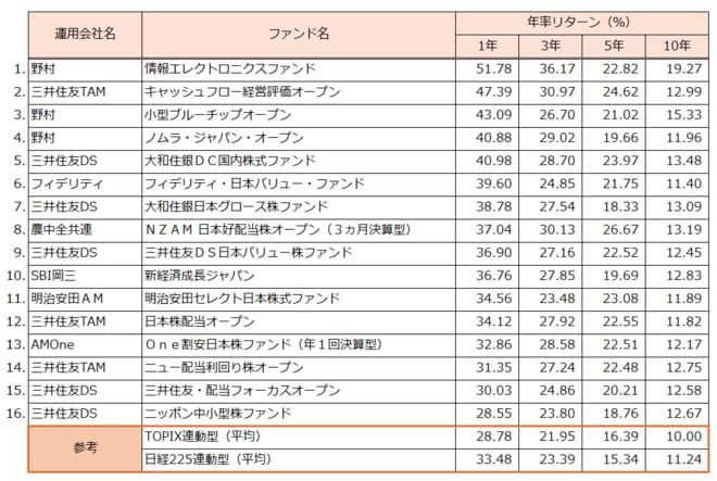 では実際に、どのような視点でファンドを見ていけばよいのか。本稿では参考として、主として国内株式を投資対象とするアクティブファンドの中から、過去1年、3年、5年、10年で市場平均(ここでは、TOPIXまたは日経平均株価のインデックスファンドの平均リターンを採用)を概ね上回り、かつ、リスク調整後リターンも良好だったものをいくつか紹介する。いずれも信託報酬控除後の実績に基づき、リターンの継続性を重視して選定した。