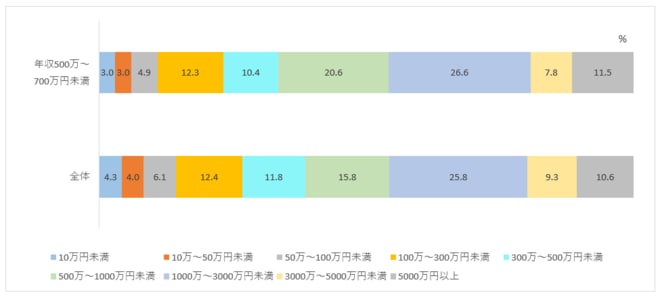 年収500 万~700万円未満の個人投資家が持つ金融資産額はいくらなのか。調査結果によれば、回答率1位は「1000万~3000万円未満」で26.6%。2位は「500万~1000万円未満」(20.6%)、3位は「100万~300万円未満」(12.3%)と続く。