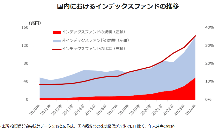 世界的にインデックス運用偏重の流れが起きているが、あまりにインデックスファンドの比率が大きくなれば、アクティブファンドのナラティブがマーケットに反映されなくなる。結果、インデックスファンドが信じるナラティブも実現しなくなるだろう。「自分はインデックスファンドだけで良い」というスタンスをとるのは自由だ。ただ、アクティブ運用によるナラティブの追求こそが、インデックス運用が成立するための必要条件であることは、知っておいてもよいのではないか。